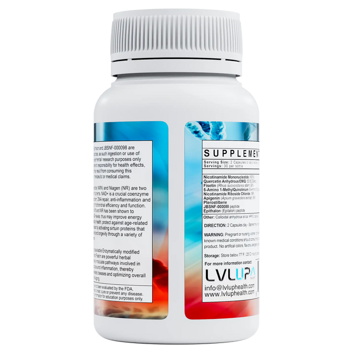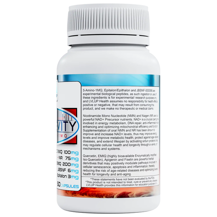 In addition to these key ingredients, LONGEVITY 5-AMINO 1MQ includes supportive compounds such as Trimethylglycine (TMG), which is known to promote athletic performance and metabolic function by reducing oxidative stress and enhancing insulin sensitivity. AAKG (Arginine Alpha-Ketoglutarate) is also present to bolster mitochondrial function, improve nitric oxide production, and optimize blood flow for better nutrient delivery. Furthermore, natural derivatives like Apigenin and Fisetin contribute by modulating pathways involved in cellular senescence, apoptosis, and inflammation - factors critical to reducing the risk of age-related diseases.