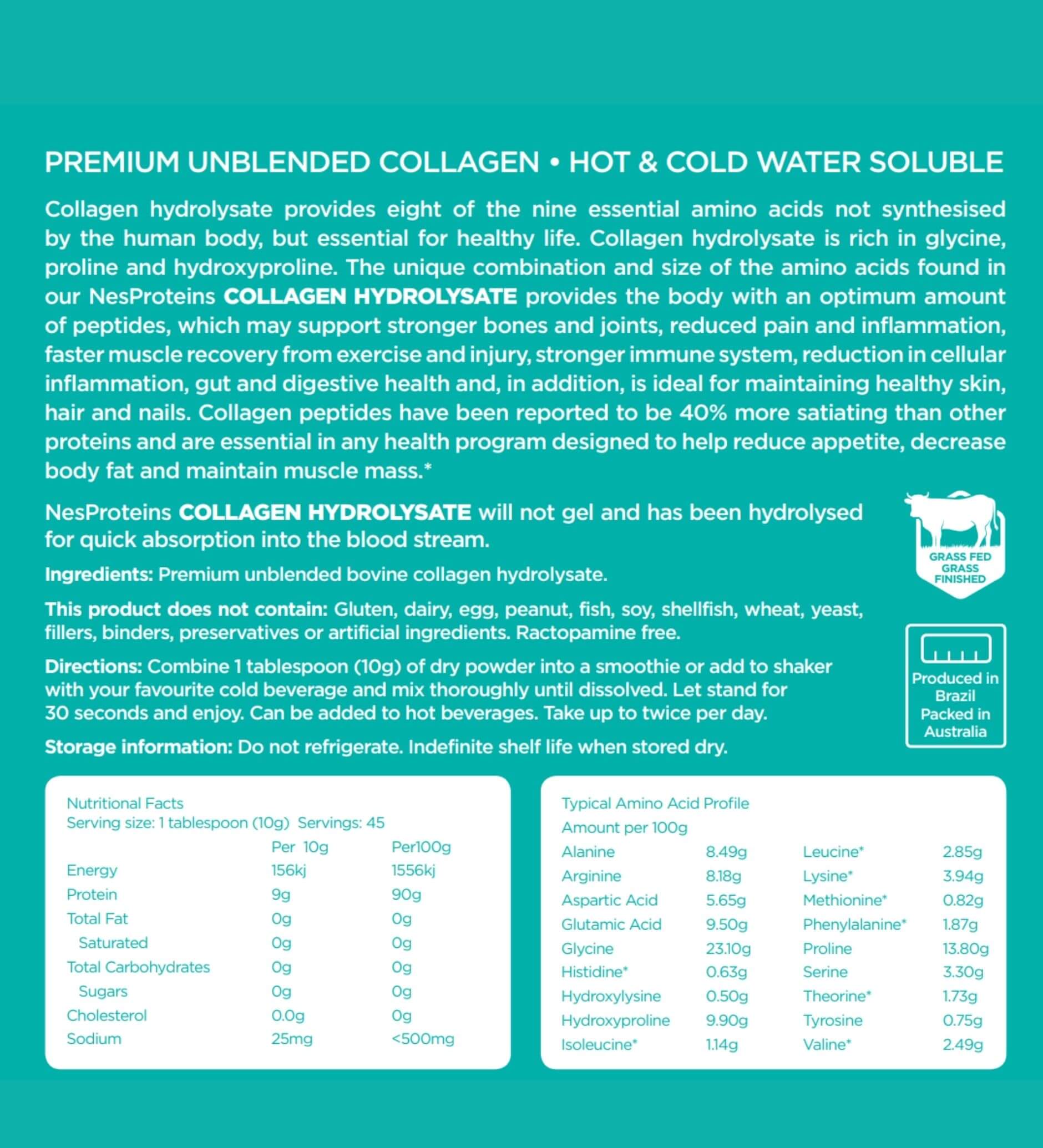 Experience the ultimate in collagen supplementation with NesProteins Grass Fed & Finished Collagen Hydrolysate. Crafted from premium grass-fed and finished cattle, the collagen is a testament to purity and quality, free from the harmful chemicals often associated with conventional farming practices.