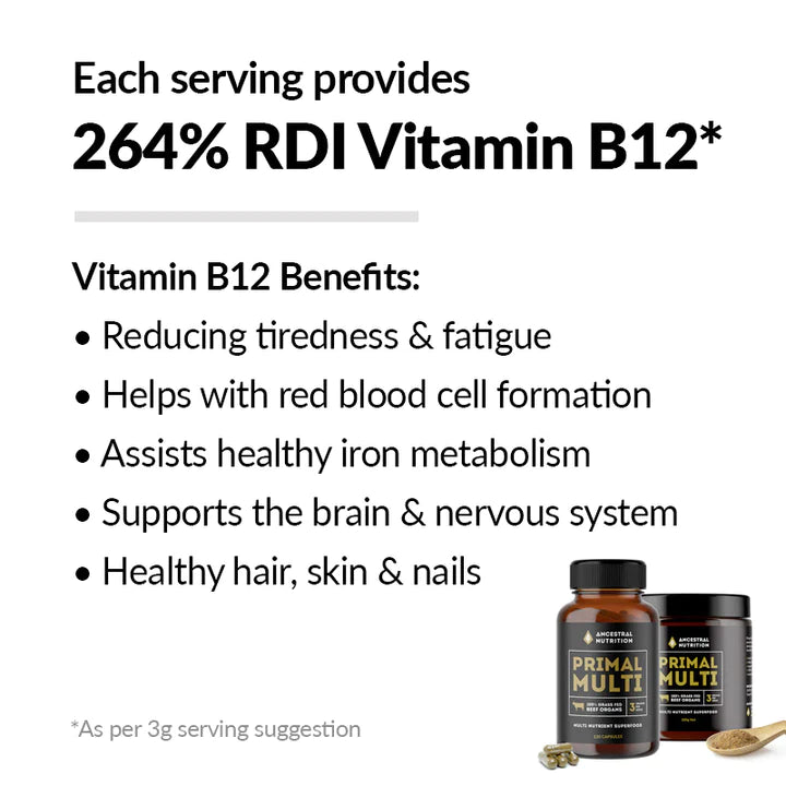 Discover the power of nature's treasure trove with Primal Multi by Ancestral Nutrition, a blend of three prized organs from pastured-raised Tasmanian cattle encapsulated for your convenience. Ancestral Nutrition's unique liver, heart, and kidney blend delivers essential nutrients such as CoQ10, B12, and selenium, promoting overall health, vitality, and sustained energy levels.