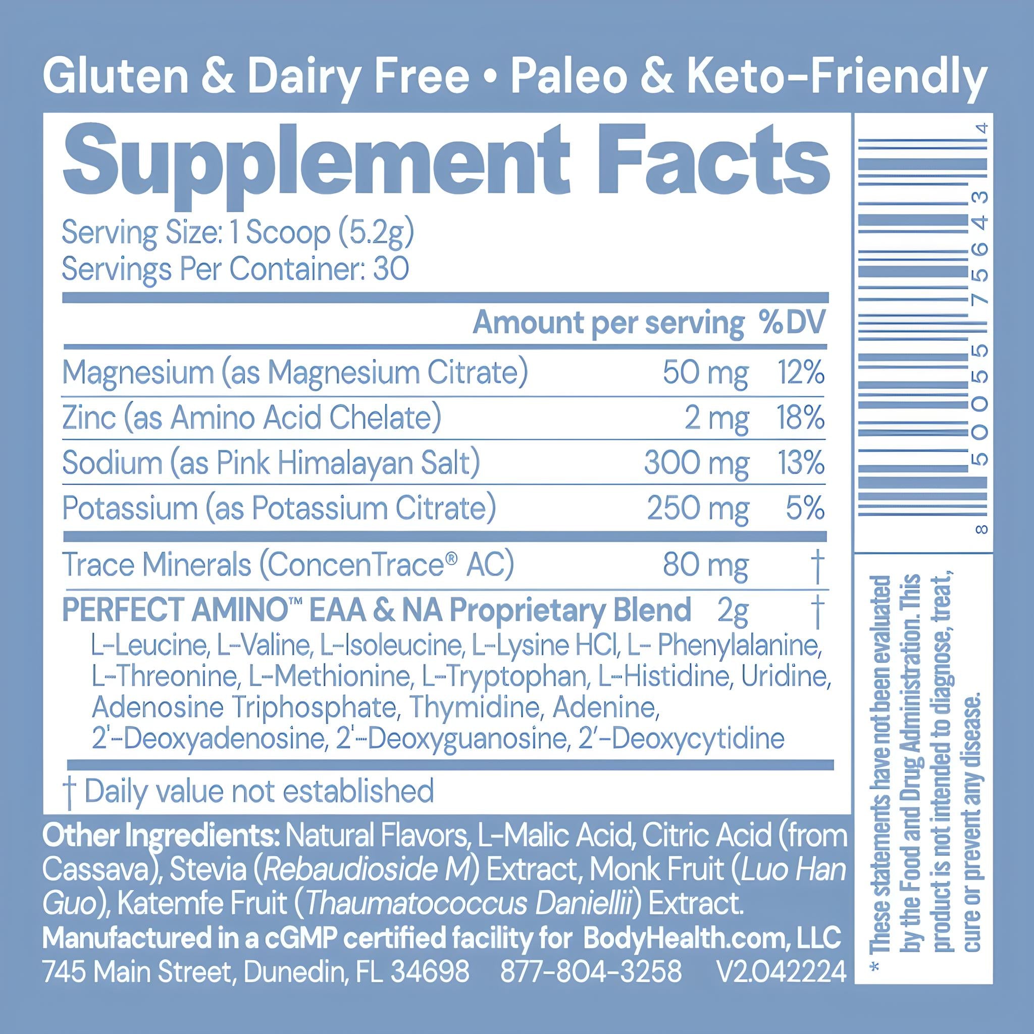 The Power of PERFECT AMINO Electrolytes: Replenishing lost electrolytes is essential after physical exertion, as sweating can deplete these crucial minerals, impacting energy, brain function, and heart health. Simply drinking water can sometimes exacerbate dehydration by flushing out essential electrolytes. PERFECT AMINO Electrolytes deliver balanced hydration to promote full recovery and optimal performance.