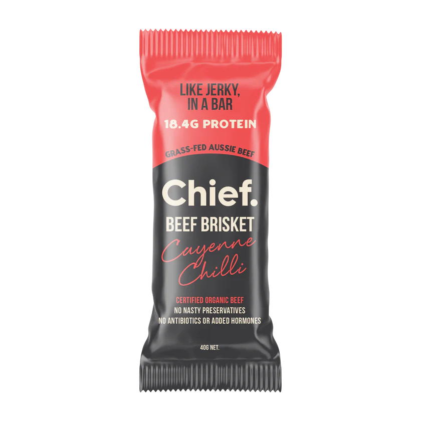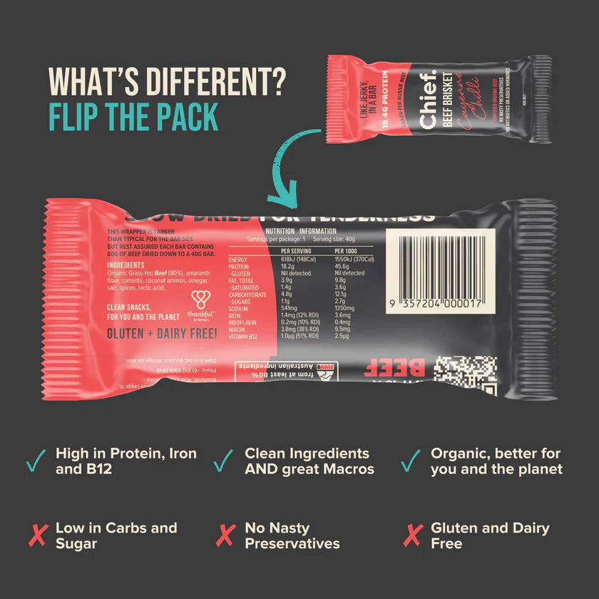 Experience the ultimate meaty snack revolution with Chief Beef Bars, made in Australia from at least 80% Australian ingredients.