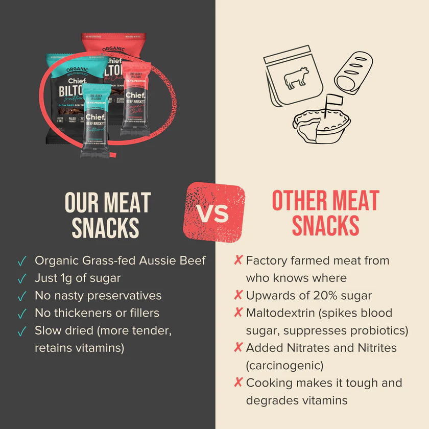 Indulge in the rich, robust flavours of Chief Beef Bars, a savoury delight crafted from 100% organic grass-fed Aussie beef. Starting with premium cuts of brisket and topside, each meticulously slow-dried to tender perfection, preserving its natural taste and nutritional goodness.