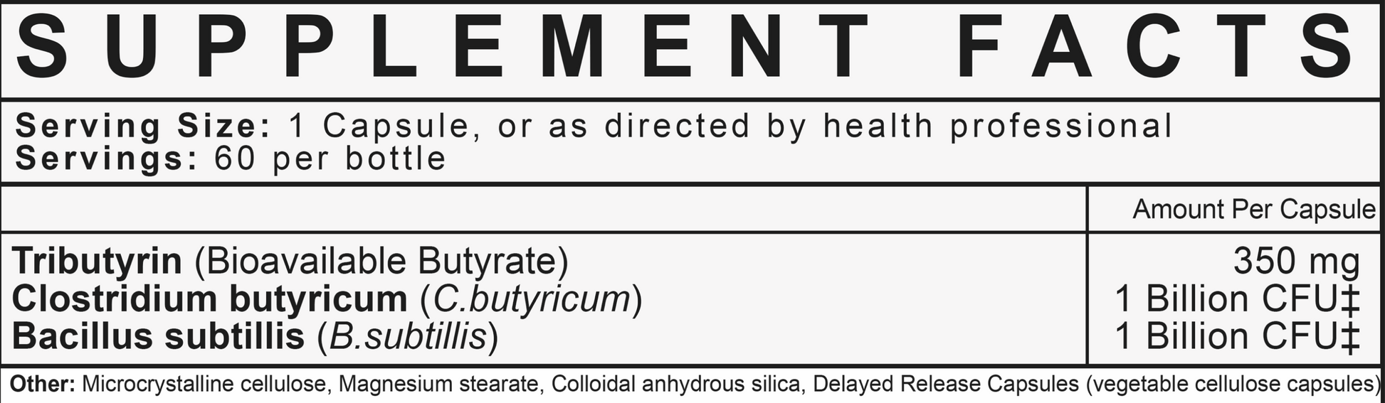 Discover the power of Tributyrin, a rapidly absorbed and stable form of the short-chain fatty acid (SCFA) Butyrate, essential for digestive health. Comprising butyric acid and glycerol, Tributyrin fuels enterocyte and colonocyte cells in the digestive tract, promoting optimal gut function and digestion. Butyrate's anti-inflammatory properties aid in maintaining and repairing the protective mucosal layer of the gastrointestinal tract, bolstering overall gut health.