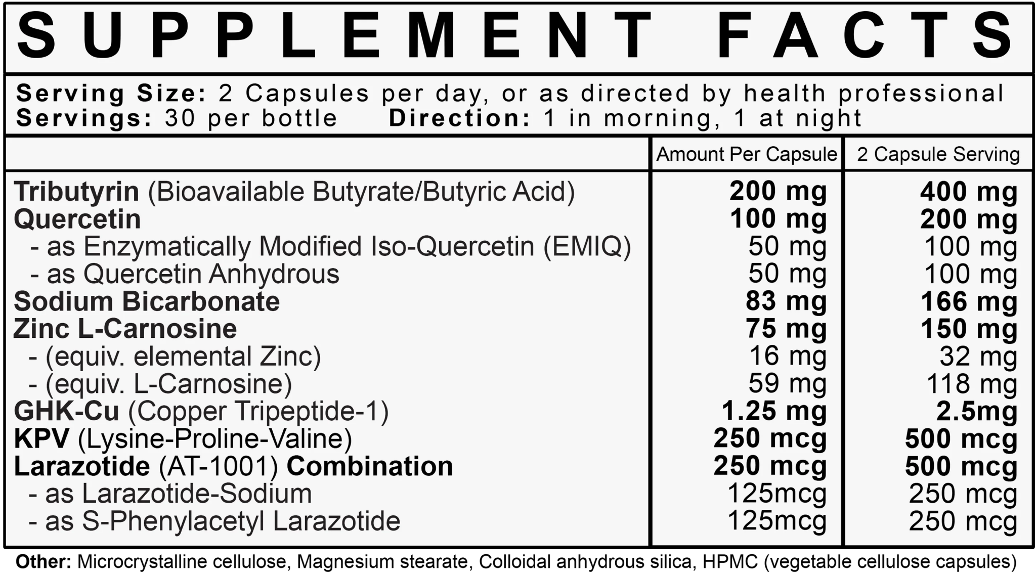 • Includes complementary compounds such as Zinc L-Carnosine, Quercetin (EMIQ for enhanced absorption), Tributyrin, and Sodium Bicarbonate