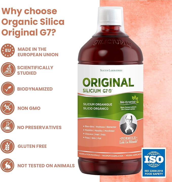 Silicium G7 Original is a vegan liquid supplement featuring biodynamised silicon to promote connective tissue health. It aims to support collagen production, flexibility and skin elasticity, using a unique high pressure process for optimal absorption. This one-litre bottle makes it easy to incorporate silicon into your daily regimen for overall vitality.