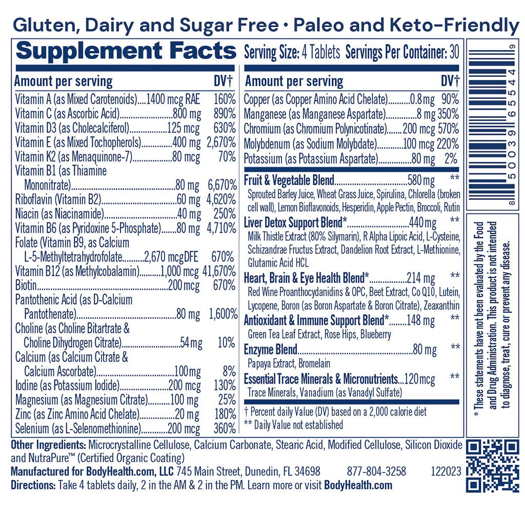 Body Health Multi Complete offers a full-spectrum multivitamin blend that combines bioactive vitamins, minerals, and whole-food concentrates in a plant-based formulation. It is designed to help fill nutritional gaps and support general wellbeing when used as part of a balanced lifestyle.
