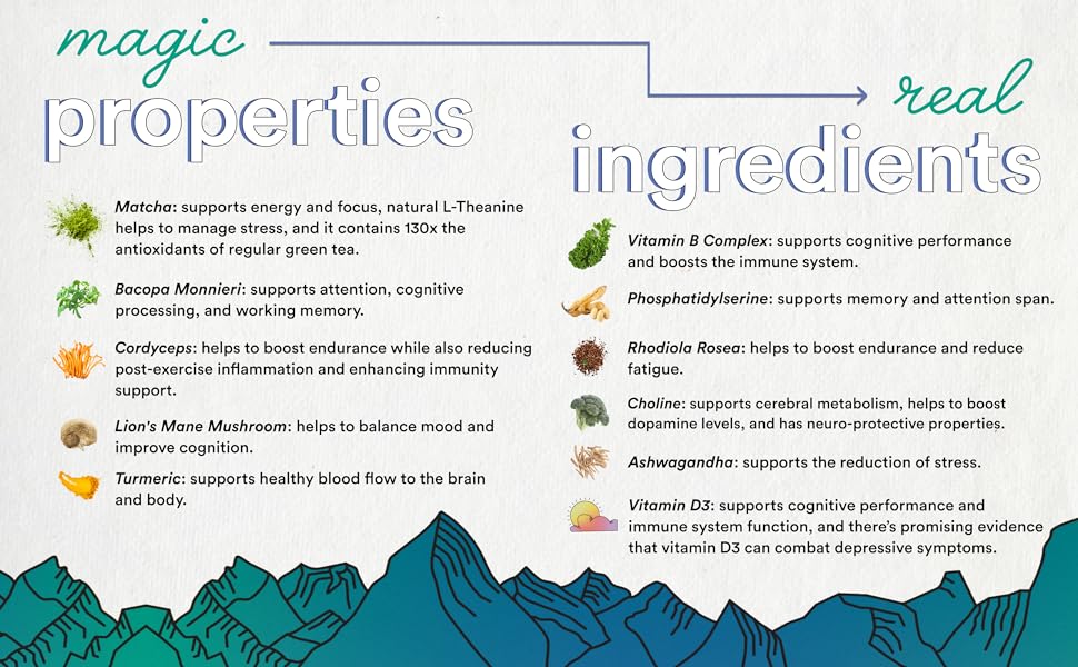 • Active ingredients (nootropics, adaptogens, etc.): Organic Ceremonial Grade Matcha (leaf), Bacopa Monnieri (whole herb), Lion’s Mane mushroom (fruiting body), Cordyceps mushroom, Rhodiola rosea (root), Turmeric (root), Ashwagandha (root), Cognizin® Citicoline, L-Theanine
