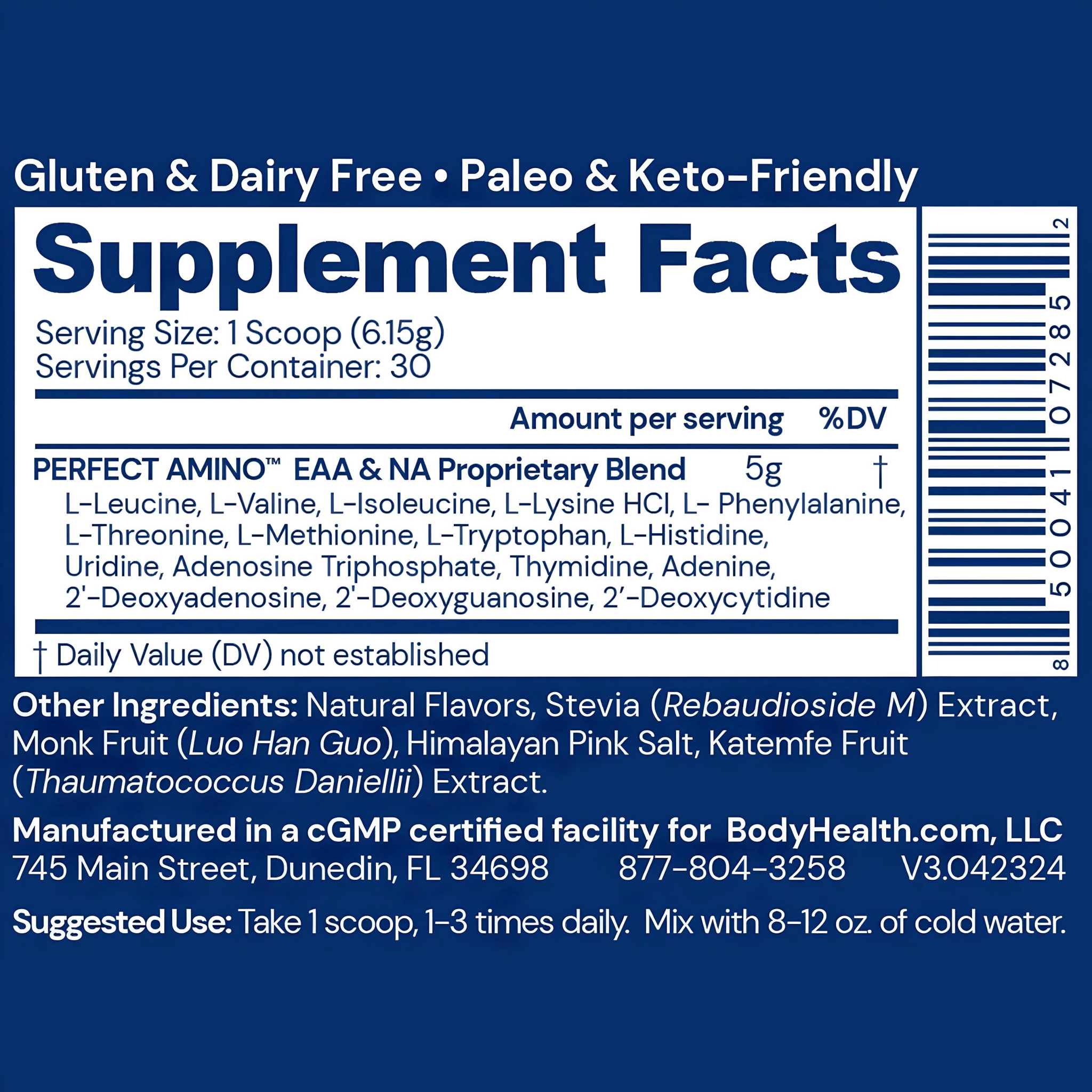 Perfect Amino Powder in Chocolate offers a high-quality blend of essential amino acids in a low-calorie, fast-absorbing formula that supports daily nutritional needs. This vegan and allergen-friendly supplement delivers all eight essential amino acids in a precise ratio to help support protein formation in the body without added calories.