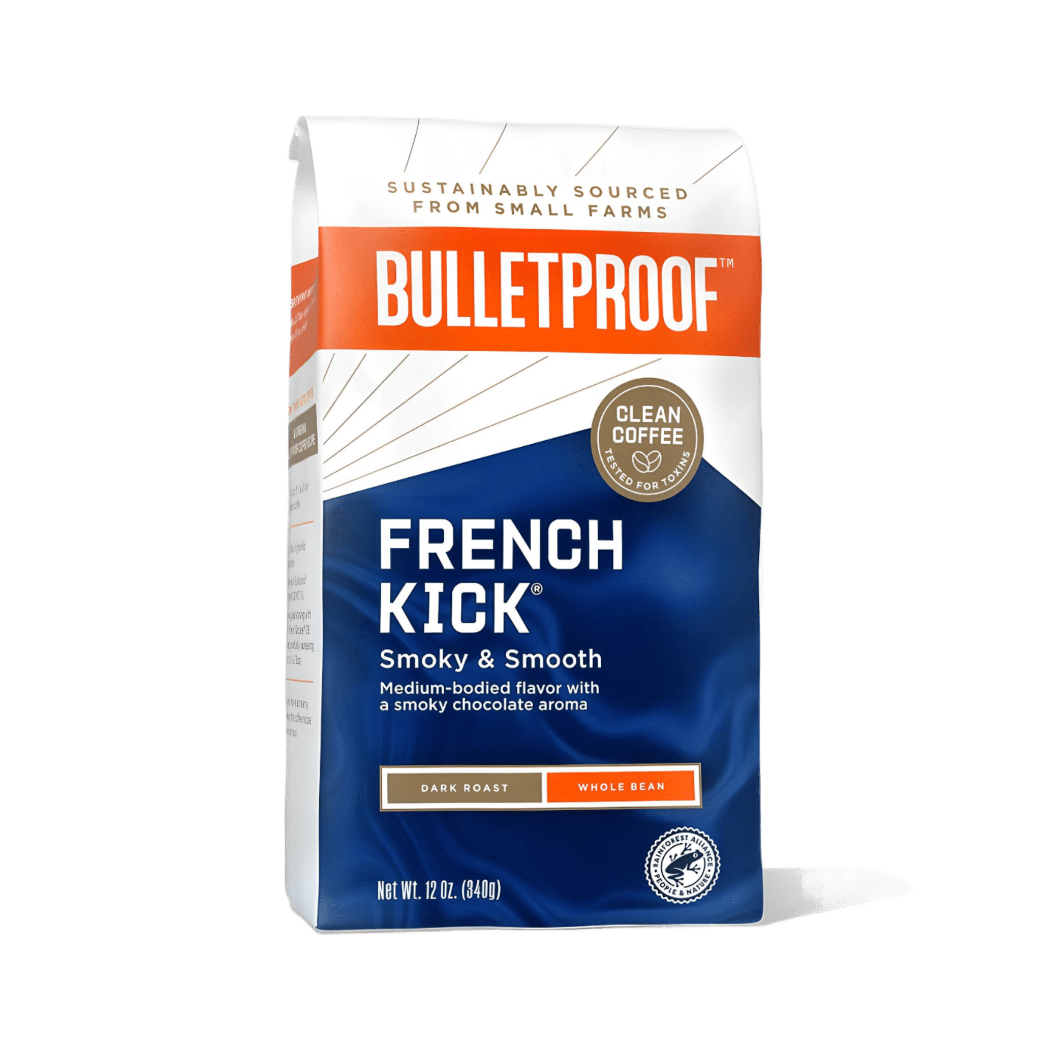 Bulletproof French Kick Whole Bean Coffee offers a bold, clean, dark roast crafted for those who prefer a smoky, chocolatey aroma and full flavour profile. Every batch is tested for toxins and sourced in accordance with sustainable standards to ensure quality in your daily coffee ritual.