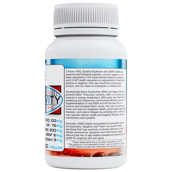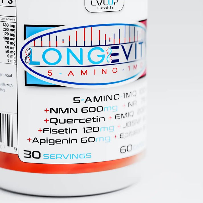 In addition to these key ingredients, LONGEVITY 5-AMINO 1MQ includes supportive compounds such as Trimethylglycine (TMG), which is known to promote athletic performance and metabolic function by reducing oxidative stress and enhancing insulin sensitivity. AAKG (Arginine Alpha-Ketoglutarate) is also present to bolster mitochondrial function, improve nitric oxide production, and optimize blood flow for better nutrient delivery. Furthermore, natural derivatives like Apigenin and Fisetin contribute by modulating pathways involved in cellular senescence, apoptosis, and inflammation - factors critical to reducing the risk of age-related diseases.