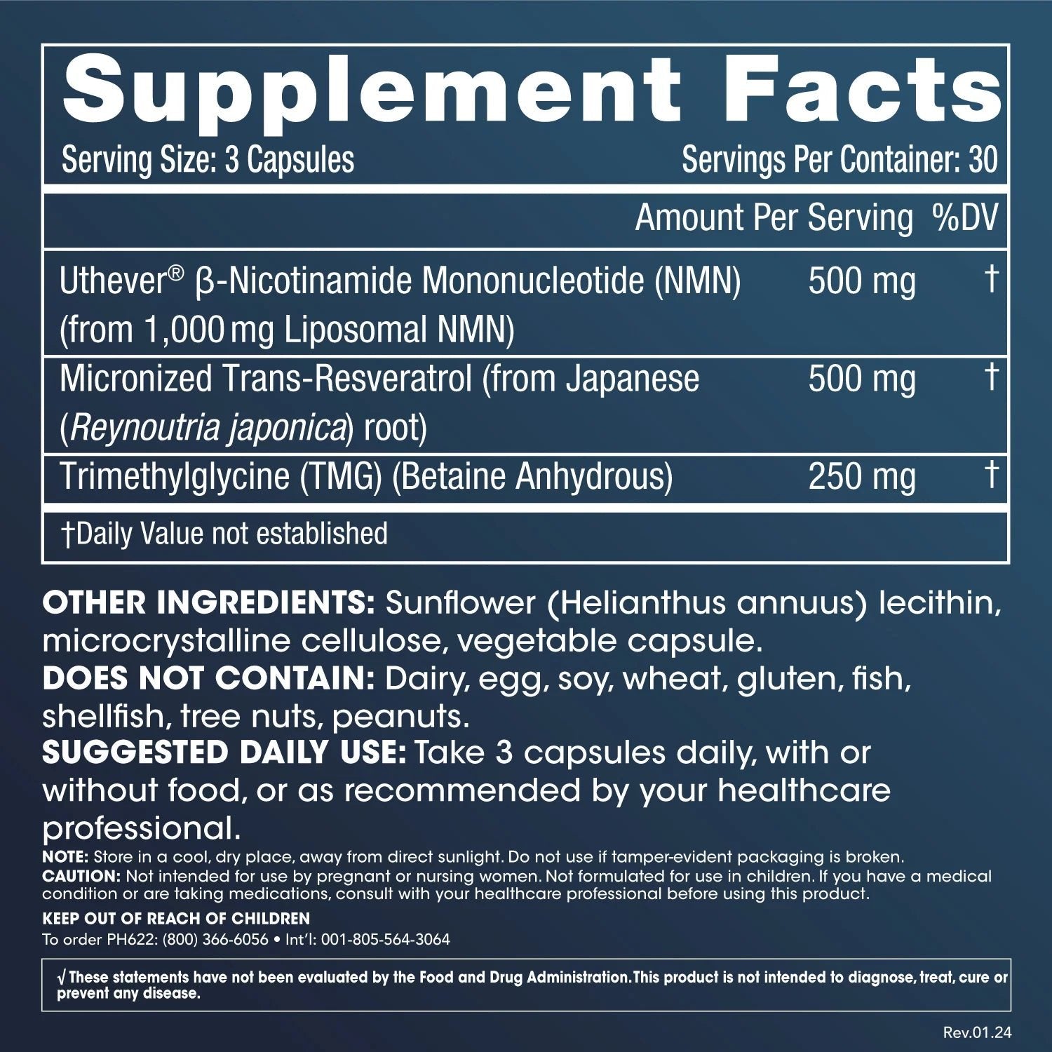 • Each serving delivers 500 mg NMN (from 1,000 mg liposomal NMN), 500 mg trans-resveratrol, and 250 mg TMG