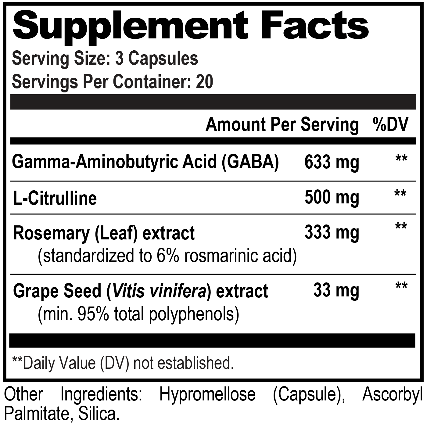 • GRAPE SEED EXTRACT (33MG): Enhances nitric oxide production, facilitating GABA's passage into the brain for optimal effectiveness.
