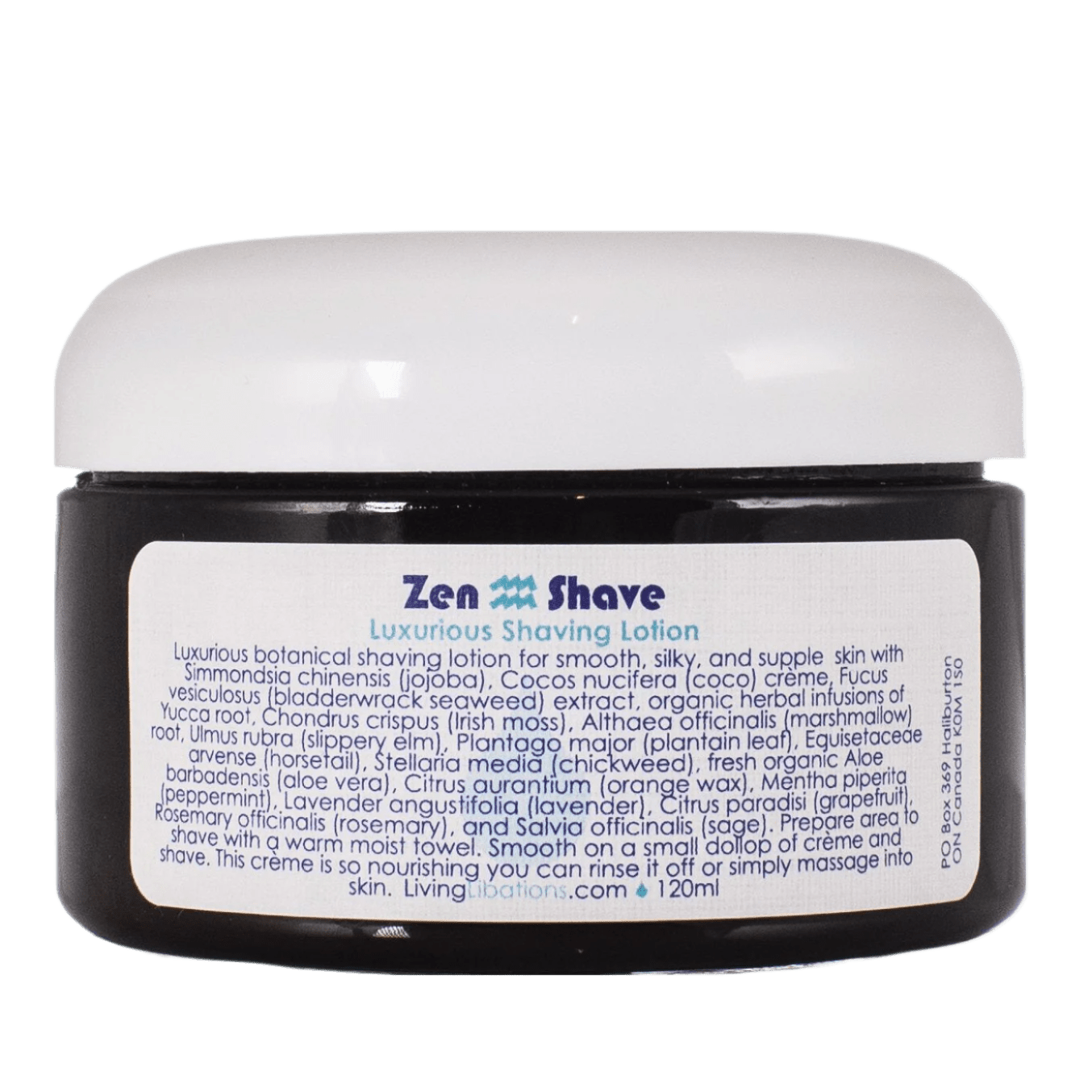 Living Libations Zen Shave is a lux shaving lotion for smooth, silky, supple skin. Zen Shave is an emollient experience that differs from drying and foaming lathers. With Zen Shave, shaving becomes a delightful caress to the skin, not a surfactant attack that leaves you with razor burn, dryness, and redness. To use, simply apply a small dollop of creme onto the skin and shave. This creme is so nicely nourishing you can rinse off or simply massage into the skin after shaving. Both men and women appreciate the aroma and the smoothing pleasures of this shave creme. One dime-sized dollop goes a long way for the silkiest, just shaved skin.