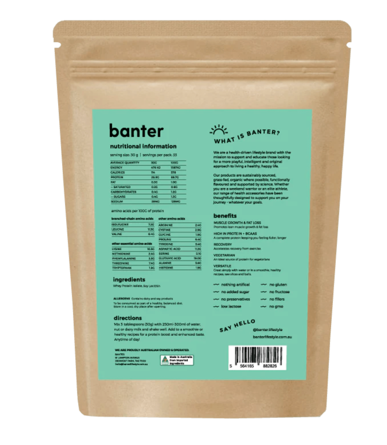 Banter, formerly known as The Naked Co, proudly presents its premium undenatured Grass-fed Whey Protein Isolate (WPI), sourced from New Zealand's grass-fed dairy cows. Banter's WPI is meticulously selected to ensure it is free from growth hormones, chemicals, antibiotics, and genetically modified organisms (GMOs). They prioritize purity by excluding fillers, artificial colors, flavours, preservatives, fructose, added sugar, gluten, and GMOs from the formulation.