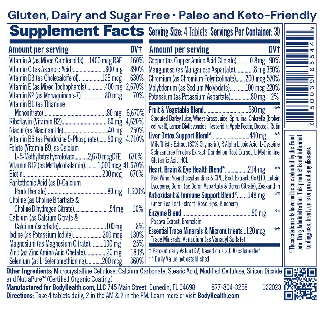 BodyHealth Multi Complete is a powerhouse daily multivitamin designed to deliver real results, using biologically active nutrients, potent whole-food concentrates, and targeted support for energy, detoxification, immunity, and overall vitality.