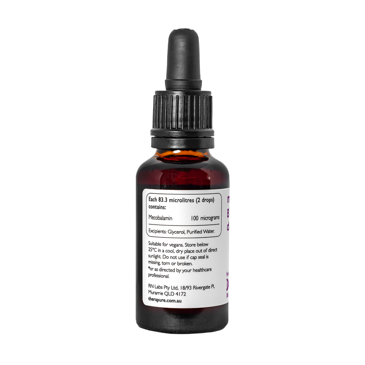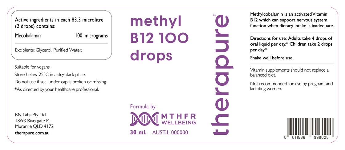TheraPure Methyl B12 100 Drops provide methylcobalamin, the biologically active and highly absorbable form of Vitamin B12, to support overall health and wellbeing when dietary intake is insufficient.
