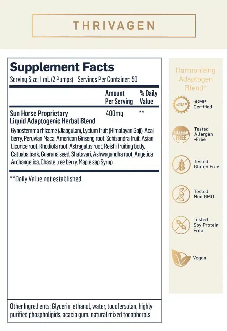 Thrivagen is a nurturing and tonifying adaptogenic formula tailored specifically for women, designed to support the delicate balance of the female endocrine system. Crafted by master herbalist Dan Moriarty of Sun Horse Energy and packaged using Quicksilver Scientific's innovative liposomal delivery system, this harmonious blend is meticulously formulated for daily use, emphasizing female wellness and vitality.