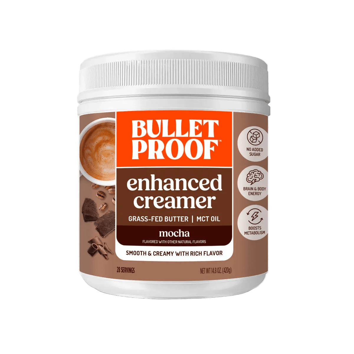 Get a chocolatey Bulletproof Coffee in an instant with Mocha Enhanced Creamer. This delicious, smooth keto creamer has grass-fed butter and MCT oil. All you have to do is add a scoop to your coffee and froth. When the quality fats blend with your brew, you get a low-sugar, milk chocolate flavoured coffee that supports energy and brain function while boosting metabolism. It's the perfect way to start your day.