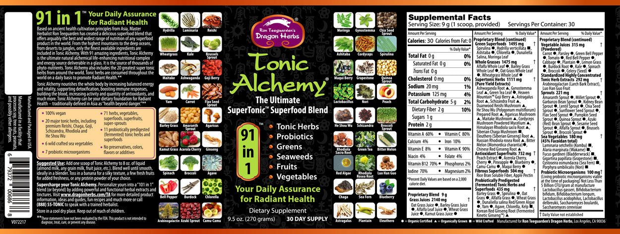 Tonic Alchemy is a powdered blend of over ninety superfoods, herbs and vegetables designed to provide broad spectrum nutrition. It aims to support energy, detoxification and overall wellness.