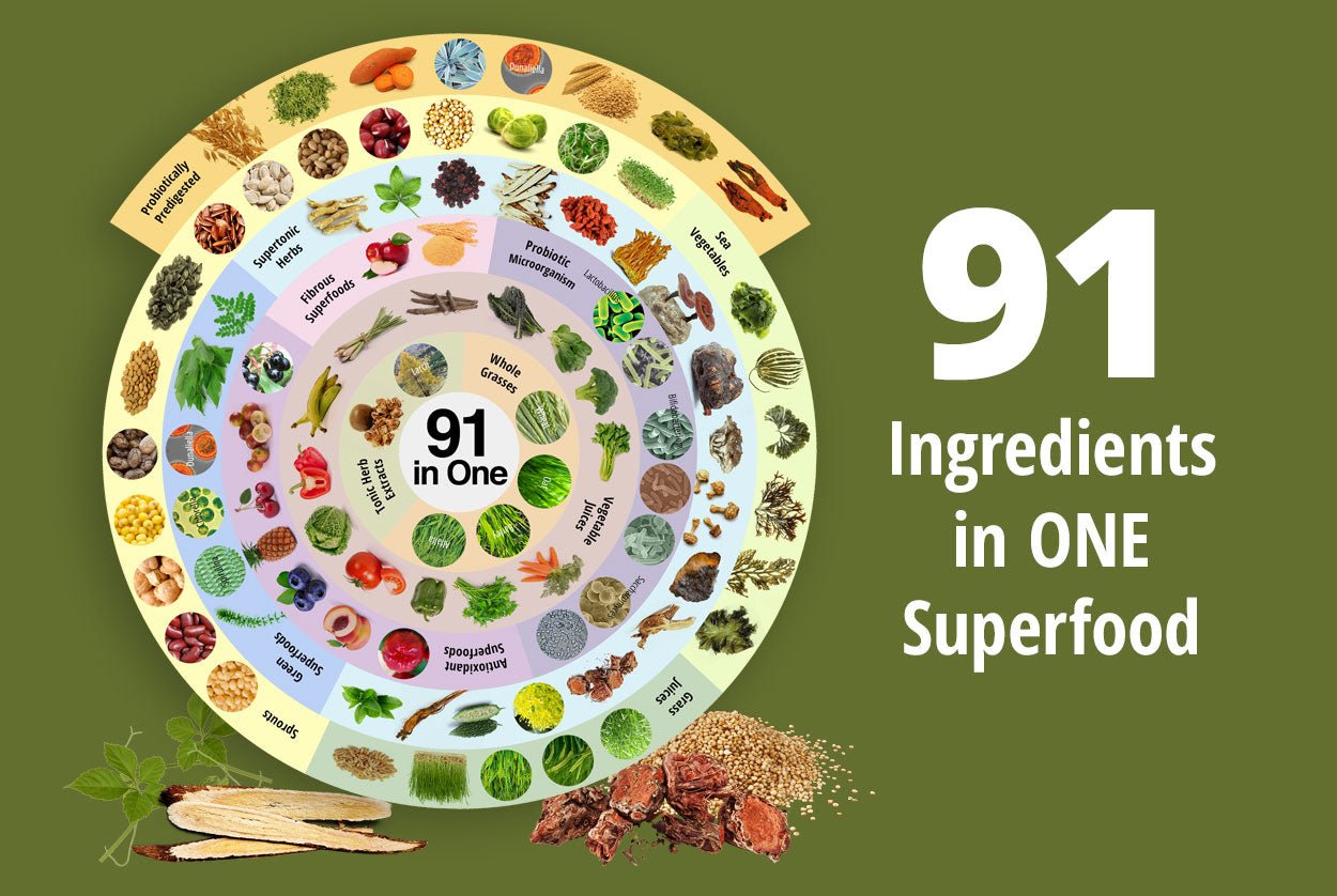 • It combines 91 ingredients—greens, tonic herbs, mushrooms, sea vegetables, sprouts, probiotics, and superfruits—offering one of the most complete superfood blends available