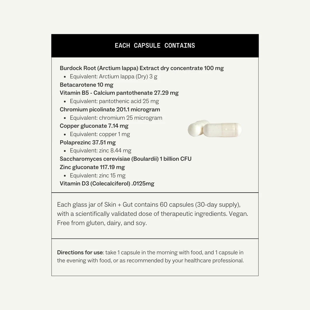 Skin + Gut is a targeted formula designed to support skin health by addressing underlying gut function. It combines probiotics, nutrients and botanicals traditionally used to support digestive balance and maintain healthy skin appearance.