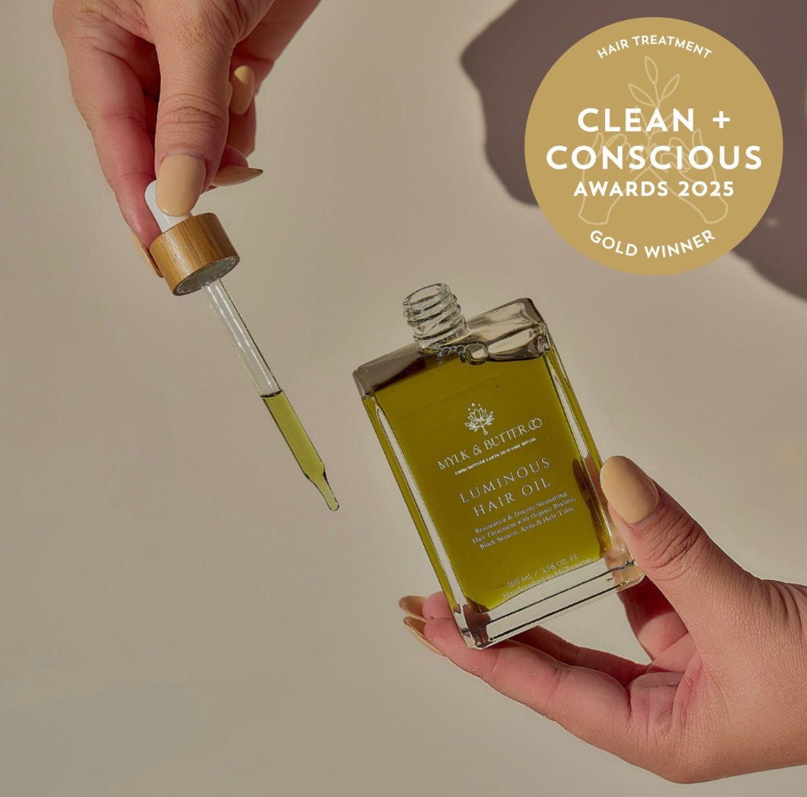 Introducing the Luminous Hair Oil from Mylk & Butter Co., a deeply nourishing treatment formulated to strengthen and revitalise your scalp and strands with ancient Ayurvedic oils and modern botanical science. This luxuriously lightweight oil brings shine, softness and improved manageability to all hair types, whether colour-treated or naturally fine.